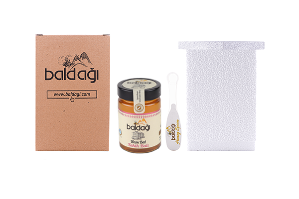 Kutu içeriği : 1 Adet Net 450 gr. kavanoz Baldağı ham kekik balı, 1 Adet kaşık bal